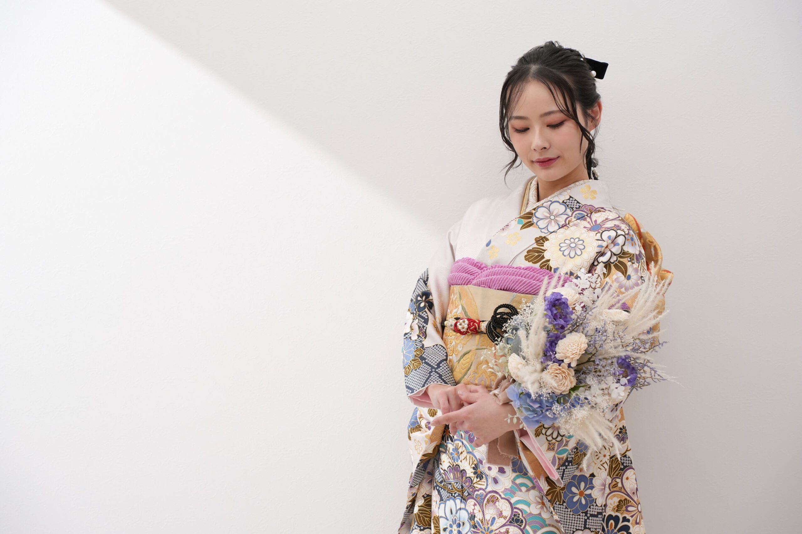 成人式当日のレンタルプランに加え、自社完備の専用フォトスタジオでは、熟練の着付け師とヘアメイクアーティストによる前撮りプランも好評です。一生の思い出となる特別な瞬間を、美しい一枚の写真として残すお手伝いをいたします。