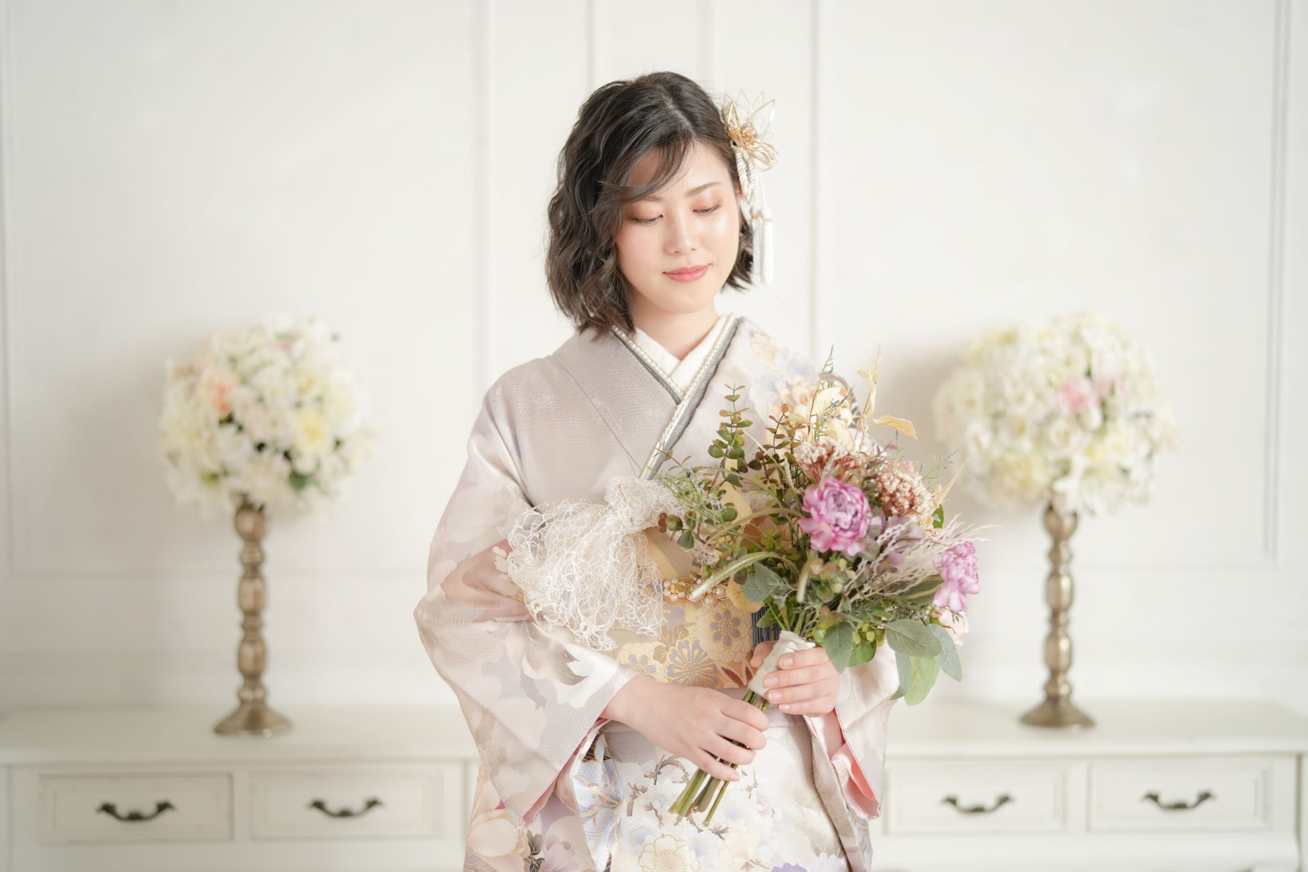 一方で、振袖が淡い色合いやシンプルな柄の場合は、小物でさりげなくアクセントを加えるのも方法のひとつ。小物の色を少しだけ足すことで写真にメリハリが生まれ、単調な印象になるのを防ぐことができます。