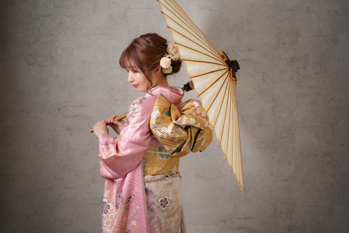 一方で、和傘や番傘は見た目の存在感が強い小物でもあります。使い方によっては、振袖よりも小物が目立ってしまうことも。