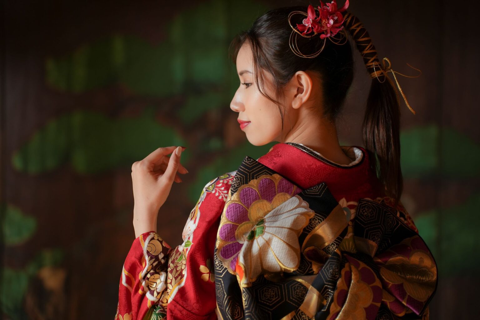 振袖の地色とは異なる色を加えることで、顔まわりにアクセントが生まれ華やかな印象になります。写真映えを意識したい場合や、少し個性を出したいときに取り入れやすい考え方です。